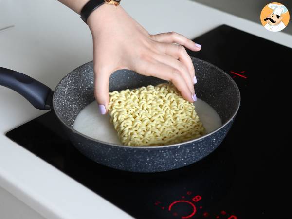 Otwórz torebkę z makaronem i umieść makaron na patelni.