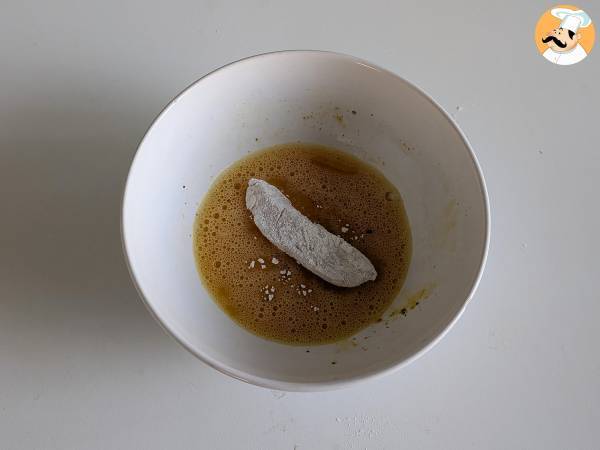 Najpierw osusz filet z dorsza papierowym ręcznikiem, aby usunąć nadmiar wilgoci (w ten sposób bułka tarta będzie lepiej przylegać do mięsa).