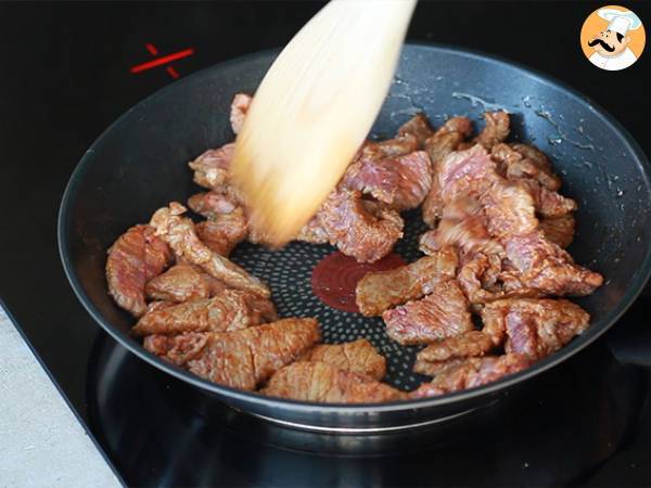 Umieść mięso na patelni z rozgrzanym olejem. Smaż szybko, około 3 minut: chcemy je tylko obsmażyć. Odstaw na bok.