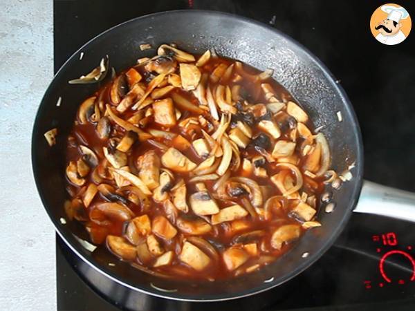Dodaj wodę, kostkę rosołową, sos Worcestershire, koncentrat pomidorowy oraz sól i pieprz. Dobrze wymieszaj i gotuj przez około dziesięć minut, aby zredukować sos.