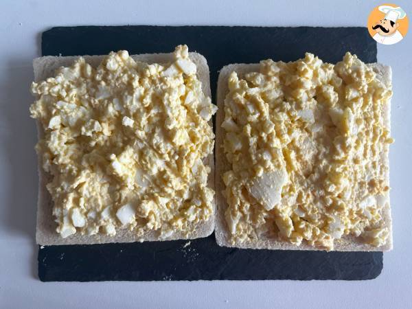 Rozłóż mieszaninę równomiernie na 4 kromkach chleba kanapkowego i zamknij kanapki. Schłodzić przed podaniem.