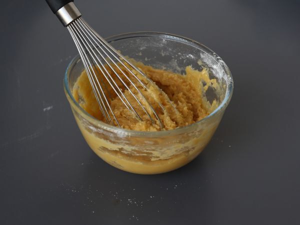 Dodaj roztopione masło, mąkę i proszek do pieczenia i dobrze wymieszaj, aby uzyskać gęste, gładkie ciasto.