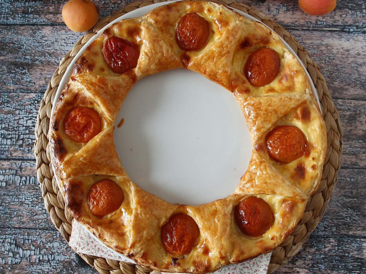 Umyj morele, osusz je i przekrój na pół. Umieść 8 połówek moreli wokół ciasta francuskiego, na wierzchu kremu. - Umieść gałązki gwiazdy na końcach ciasta francuskiego, aby utworzyć koronę. Lekko dociśnij, aby krawędzie nie uniosły się podczas pieczenia.