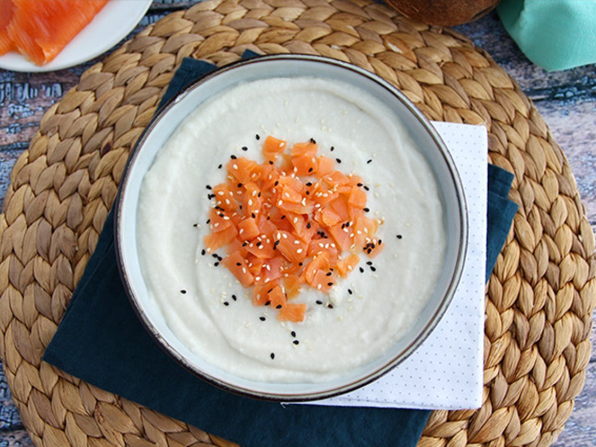 Odkryj nowy sposób na cieszenie się kalafiorem jako przystawką! Tutaj prezentujemy go w postaci kremu, połączonego z mlekiem kokosowym i posypanego wędzonym łososiem. To łatwy przepis o kremowej konsystencji. To świetny sposób na zachęcenie całej rodziny do jedzenia kalafiora ;-)