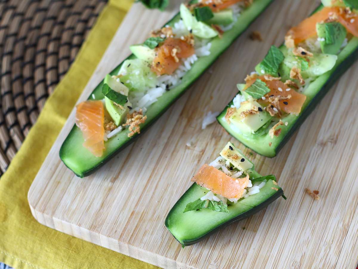 - Przekrój ogórek wzdłuż na pół. Wydrąż miąższ i pokrój na małe kawałki. Udekoruj wnętrze ugotowanym ryżem, miąższem ogórka, pokrojonym awokado i posiekanym wędzonym łososiem lub pstrągiem.