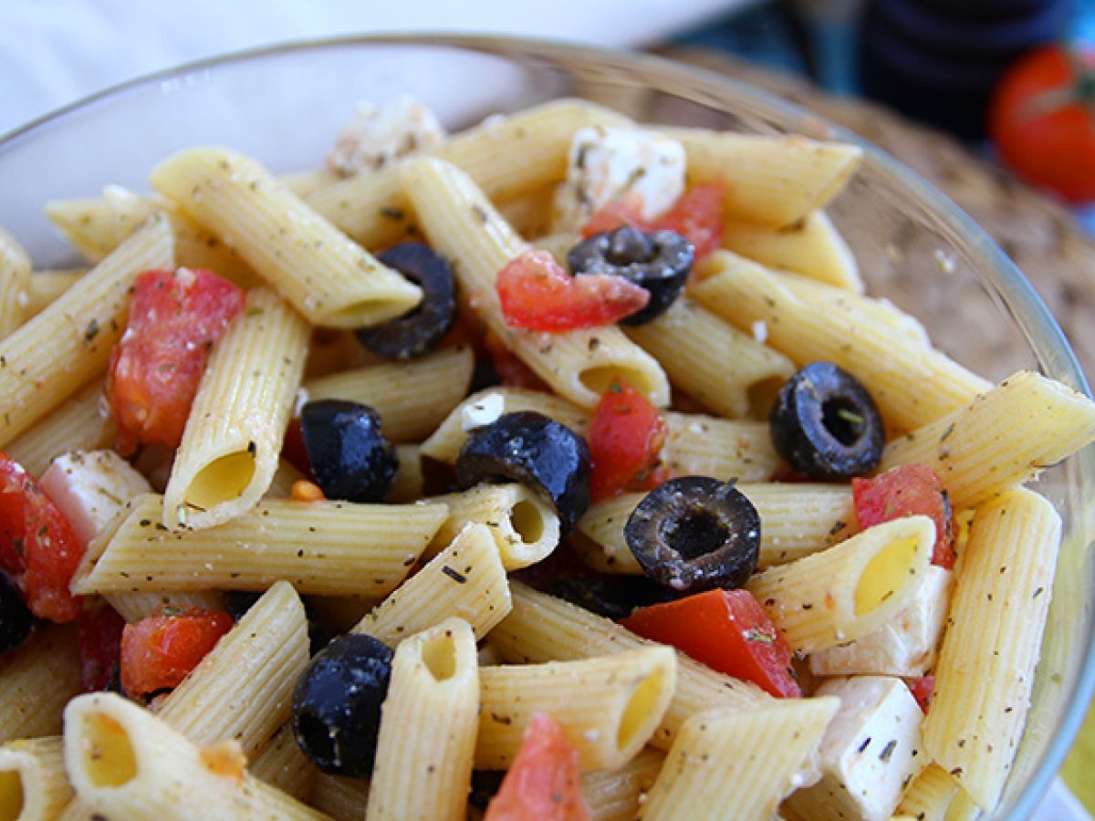 Sałatka z makaronem, pomidorami, fetą i oliwkami