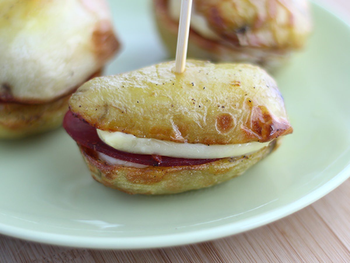 Wyjąć z piekarnika i położyć pół plasterka szynki peklowanej na połowie ziemniaków. Położyć pół ziemniaka na wierzchu i użyć szpikulca lub sznurka, aby przytrzymać ziemniaka.