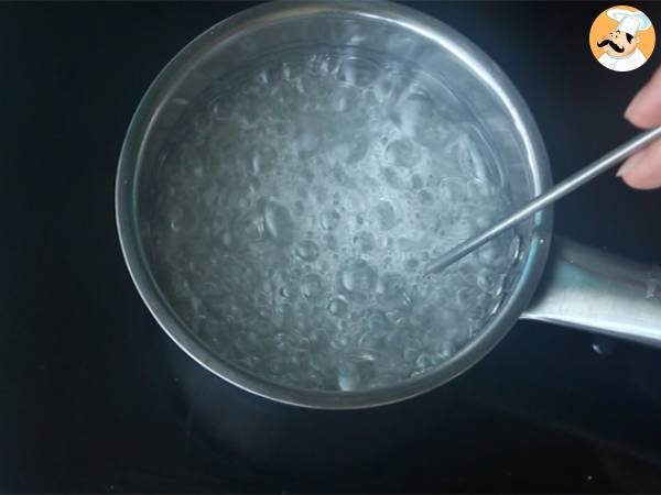 Umieść wodę i cukier w rondlu i doprowadź do wrzenia. Używając termometru, temperatura powinna osiągnąć 130°C (lub gotować się przez około 5 minut).
